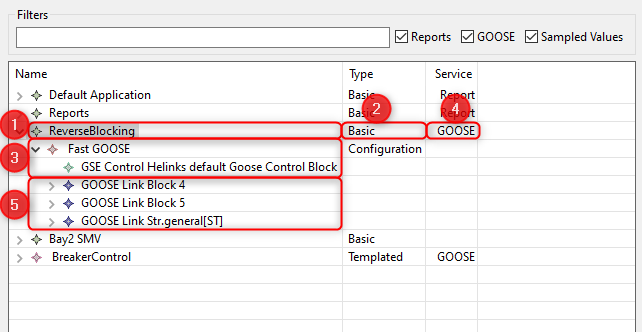 The property sheet entries of a application service are used to create the implementation of the exchange. The Service also contain a configuration object ( in the above example, GSE Control ). The properties of the configuration object correspond to attributes that are part of the implementation, and can be directly found in the resulting SCL output file.
