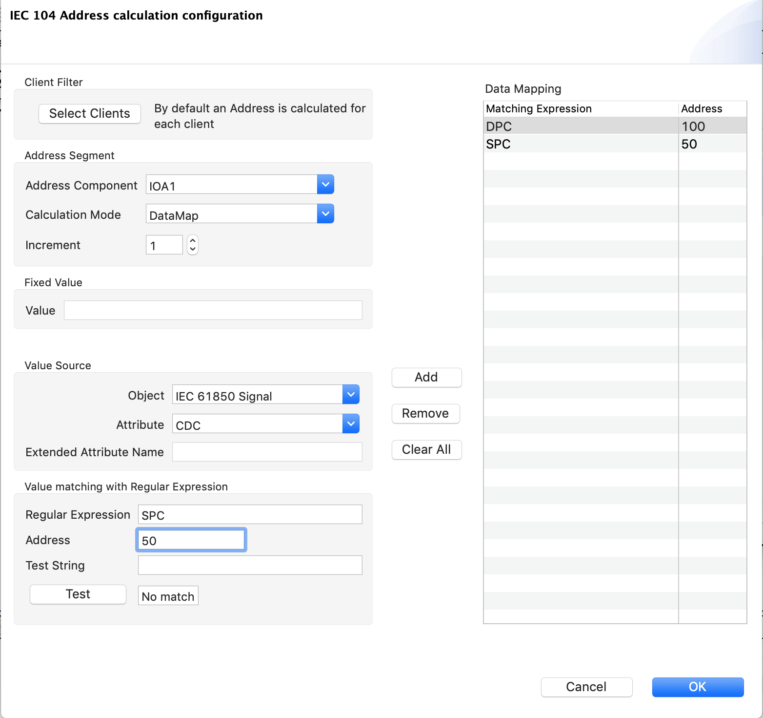 The attribute selected in the ‘Value Source’ box is evaluated with each regular expression in the DataMapping list, starting at the top. The address of the first matching expression is used.