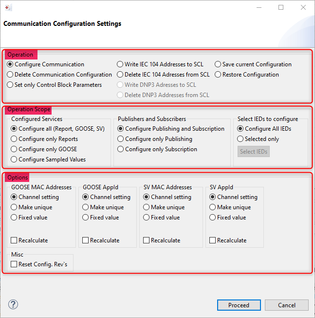 The options allow to customize specific parts (GOOSE/SV mac addresses, appid) of the communication generation with global algorithm.