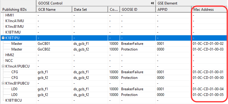 If the communication is configured already and MAC addresses are not unique, users can change them manually in the Communications Editor for each GOOSE control block. The last picture shows where to find the MAC address. In the same location, under the MAC Address column, simply press on the address filed and edit it to be unique.