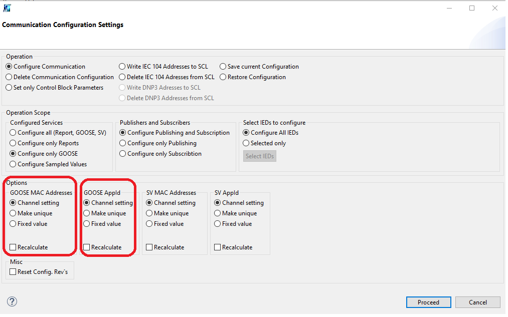 The communication configuration settings offers a variety of options in how the communication protocols should be configured. One of these options is changes to the MAC address and APPID for GOOSE and Sampled Values as shown in the picture below: