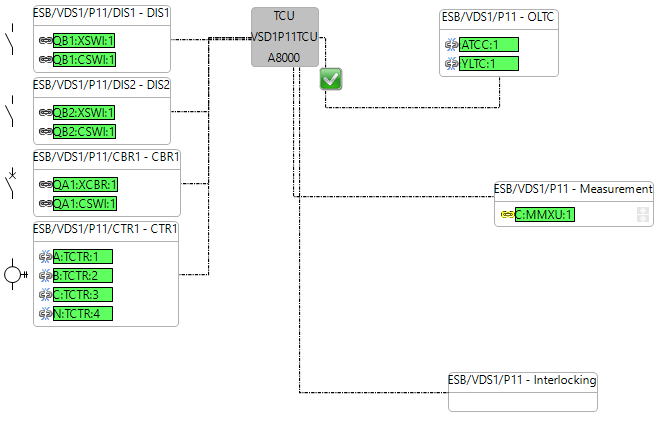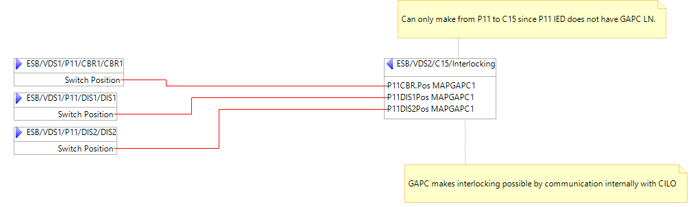 Some functions could not be applied based on the information from ESB because of the lack of availablity of logical nodes in the IEDs. For instance, the cross interlocking GOOSE applciation between C15 and P11 should be the transmission of switchgear positions to a generic logcial node (GAPC) which is internally communicating with the CILO at each bay. However, the bay P11 could not have this logical node because it does not exist in the IED data model. So, the Interlocking function is created for P11 but it is empty. The other example is OLTC tap indication and control which is covered by the logical nodes ATCC and YLTC but again, these do not exist in the P11 IED from Siemens and so the logical nodes are not mapped.