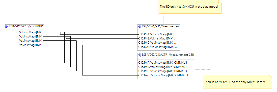 The voltage transformer values are sent from C15 to C13 and so C13 has to receive them in an MMXU logical node which is associated with a VT. However, this bay does not have a VT and so the C:MMXU which is shown for the specification for C13 is the subscriber to this information.