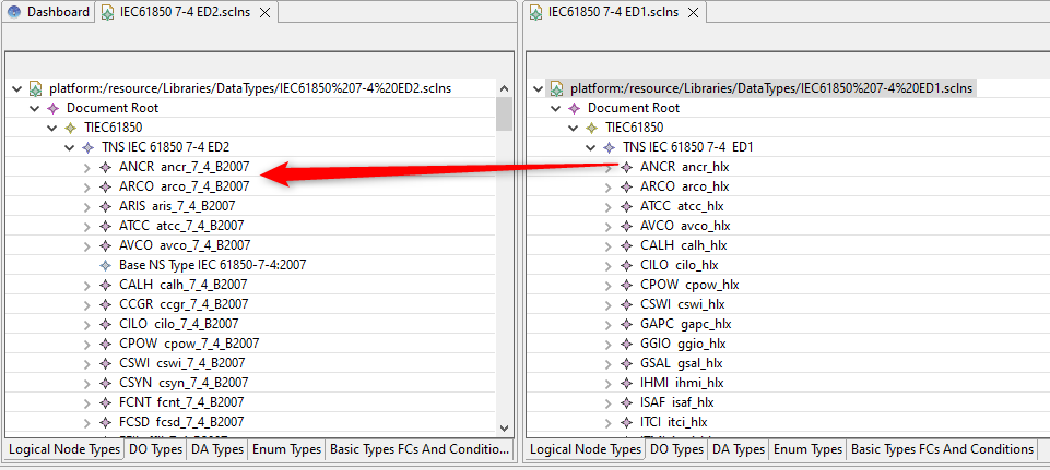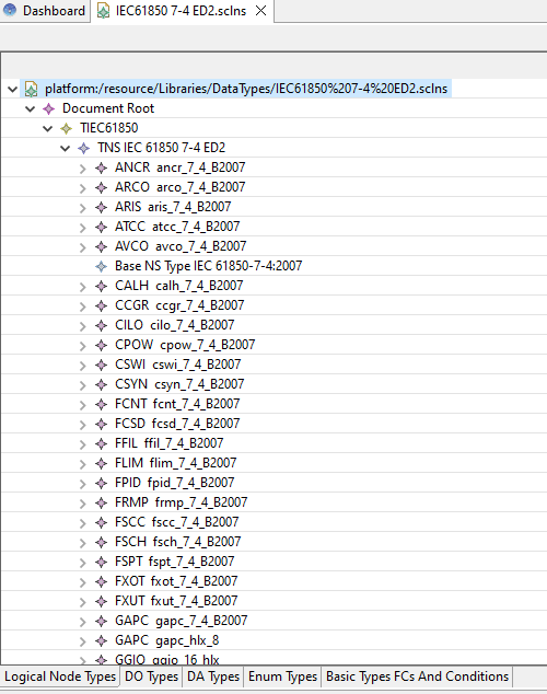 The Namespace Editor show Datatype grouped into tab (LN, DO, DA, Enum, basic FC and Condition).