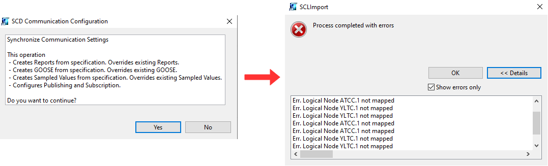 • Another window opens to ask for verification of configuring communications. Press OK. Another message will show if the configuration was a success or not. If there are errors, you can click on the option “Show Errors“. Usually the errors are related to logical nodes which are not mapped which exist in this workspace.