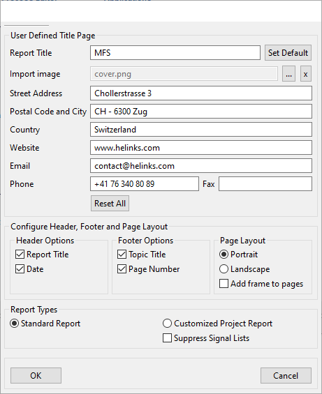 The following dialog allow you to customize the generated report.