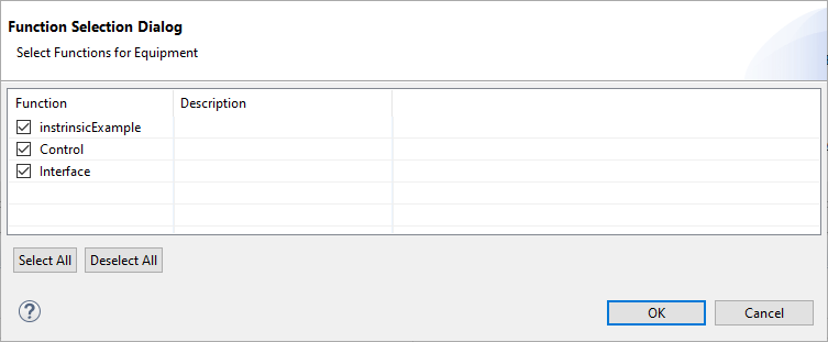 Deselecting checkmarks in this dialog will omit the deselected equipment functions from the new instantiated equipment.
