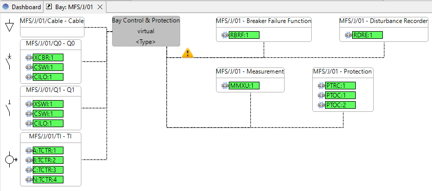 Currently the state of the virtual IED "Bay Control & protection" is virtual (in the specification phase) and this is snow by the yellow triangle icon.