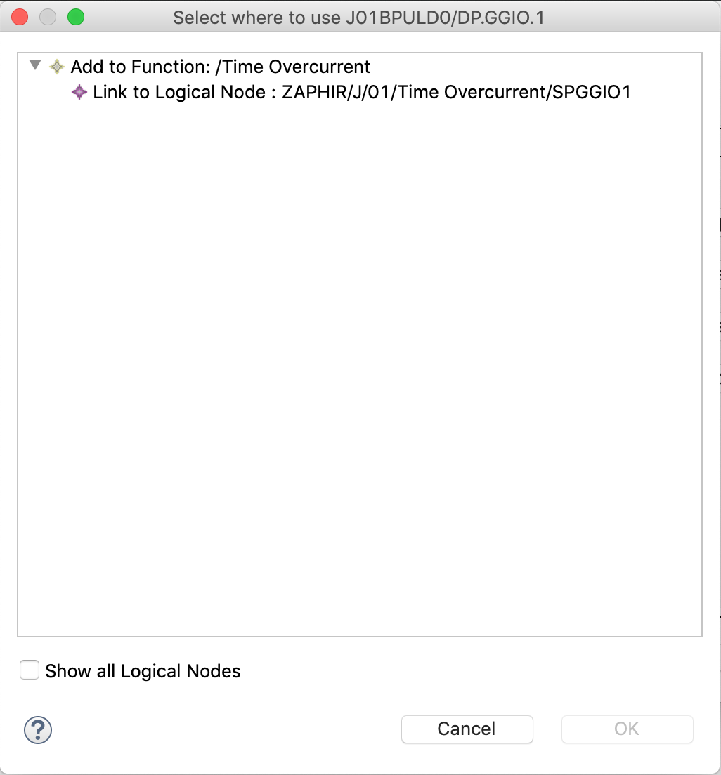 Here, a filtered view of the data model of the IED is shown. Unless ‘Show all Logical Nodes’ is selected, only logical nodes of the same class are shown. Selecting a logical node and pressing ‘Ok’ will establish a mapping between the selected logical nodes of the real device and the specification.