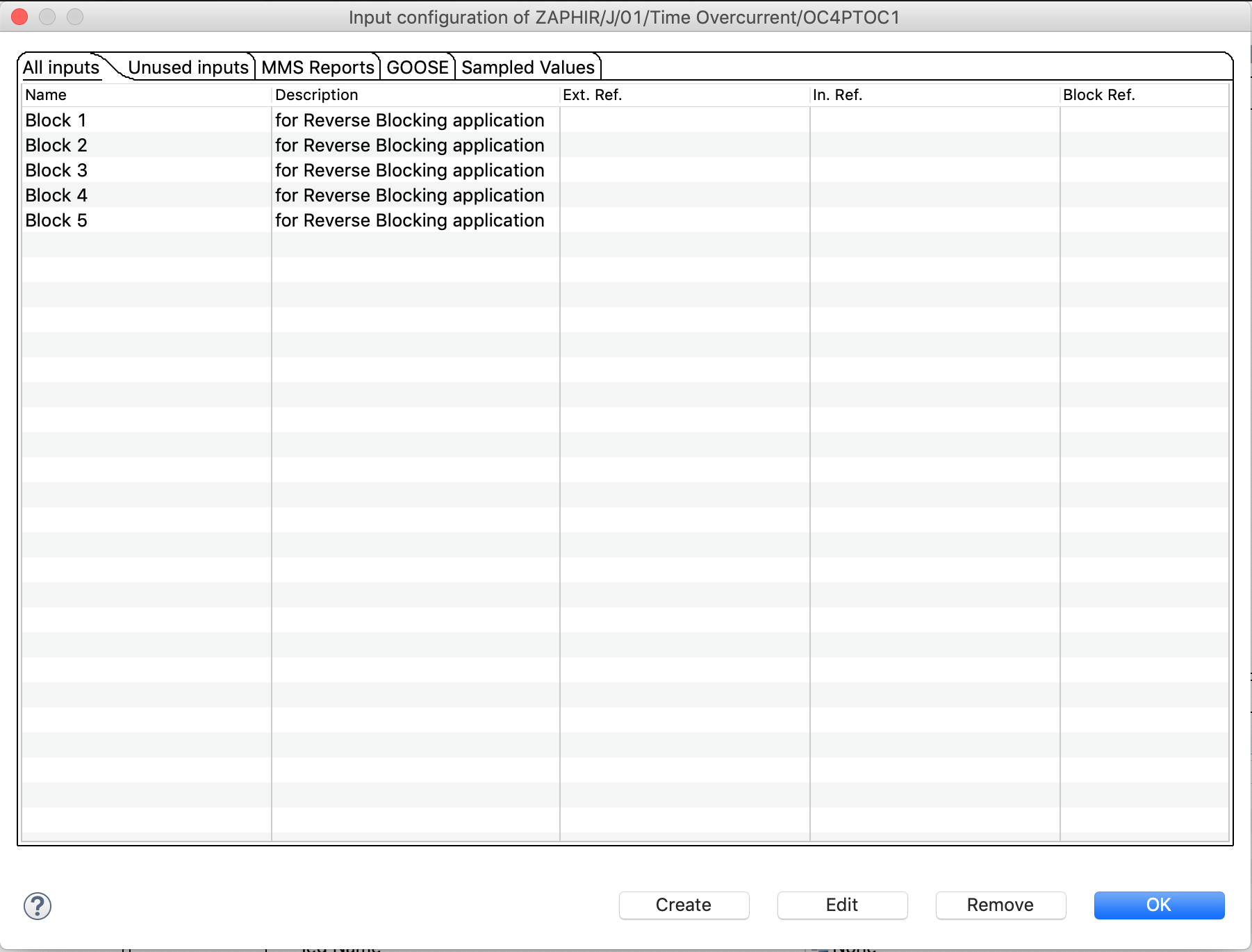 While the logical node is a pure specification, only the name and description attributes are available for editing. When the logical node is implemented by a device ( as in the example screenshot ), implementation-specific attributes become available. The buttons ‘Later Binding’, ‘Select InRefs’, ‘Select BlkRefs’, ‘Select LGOS’, ‘Select LSVS’ bring up a selection dialog that presents a filtered view of the IED structure where corresponding elements can be selected.