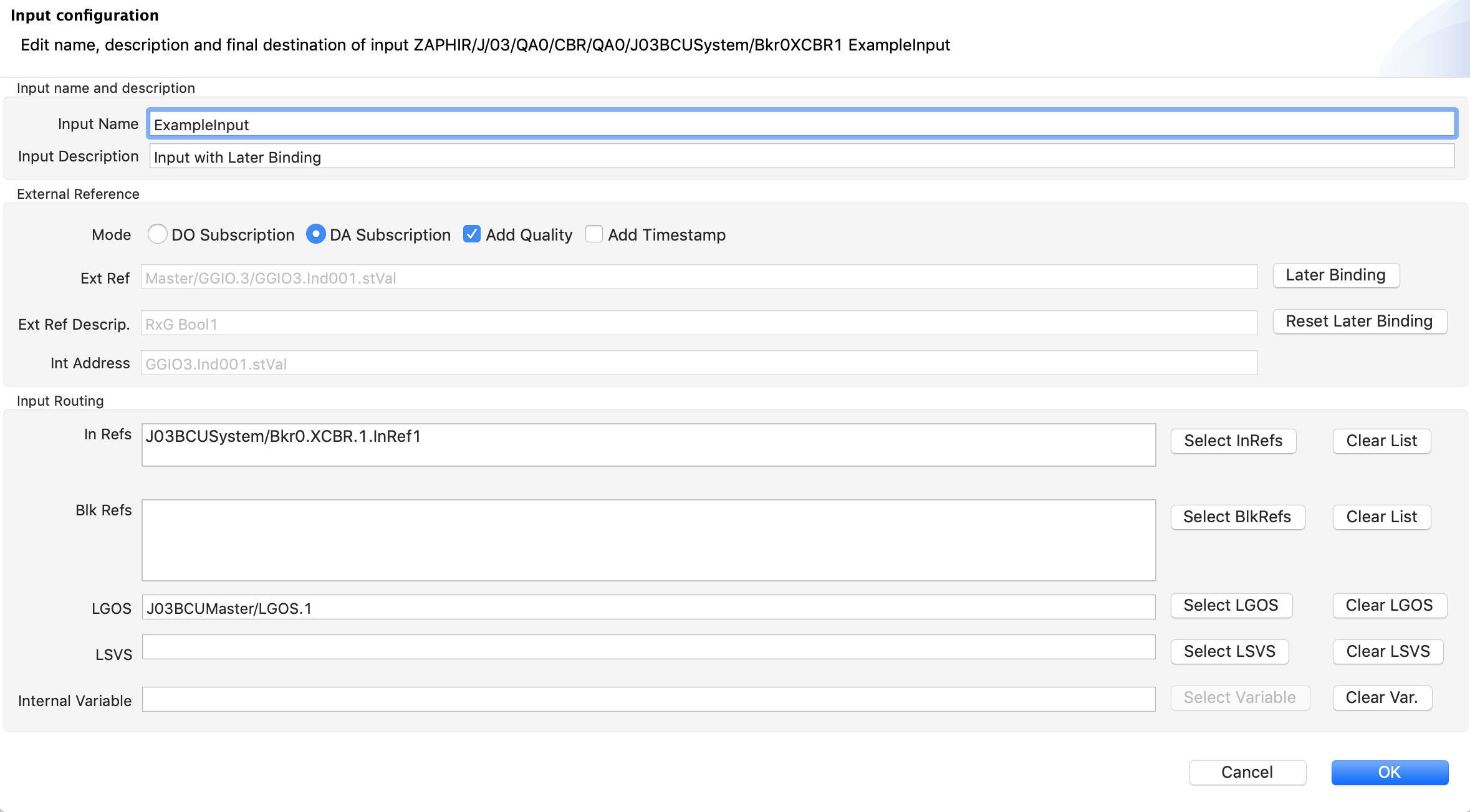 Inputs represent inbound data - they can be used to configured later binding information and internal routing, add descriptive elements and formalize requirements on the communication structure. As with Signals, there is a ‘Configure Inputs’ menu entry on the logical node that brings up a dialog to create and configure Inputs.