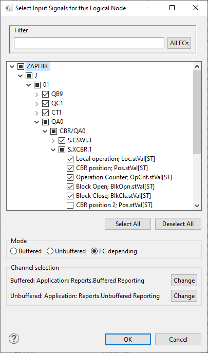 Selected Signals will be added to the default Report application - either to the Buffered or the Unbuffered configuration, depending on the settings in the selection dialog. The ‘FC depending’ will add Status values (functional constraint [ST]) to the Buffered configuration, and all other Signals to the Unbuffered configuration.