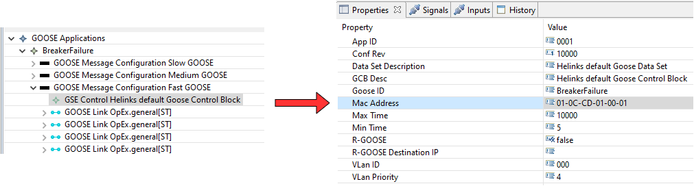 The GOOSE control block properties can be found after configuring the communication in the Helinks Communications Editor, in the tab GOOSE Matrix. the picture below shows the MAC addresses for three GOOSE applications and as it shows, they all have the same one.