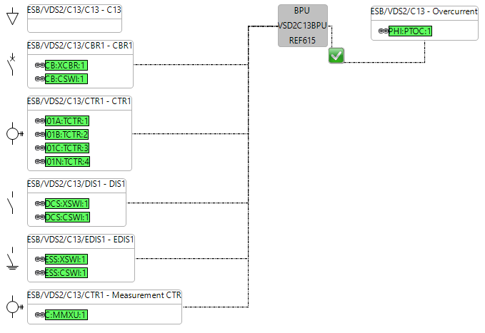 The voltage transformer values are sent from C15 to C13 and so C13 has to receive them in an MMXU logical node which is associated with a VT. However, this bay does not have a VT and so the C:MMXU which is shown for the specification for C13 is the subscriber to this information.