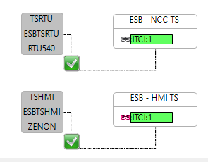 Like the configuration for the distribution substation, the signals from the bay are routed through the interface logical nodes to the an HM (Zenon) and RTU (ABB RTU 540) in the substation specification diagram in Helinks STS.