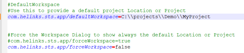 The parameter com.helinks.sts.app/defaultWorkspace In the customization_plugin.ini file allows to define a default folder or a default project for the workspace selection dialog.