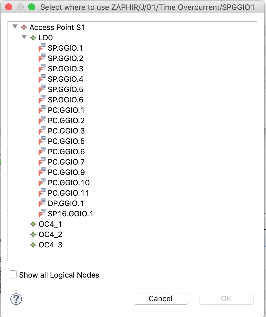 Here, a filtered view of the data model of the IED is shown. Unless ‘Show all Logical Nodes’ is selected, only logical nodes of the same class are shown. Selecting a logical node and pressing ‘Ok’ will establish a mapping between the selected logical nodes of the real device and the specification.