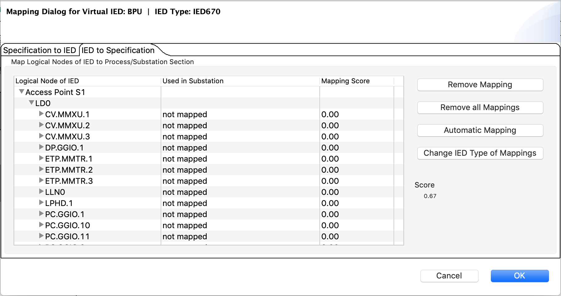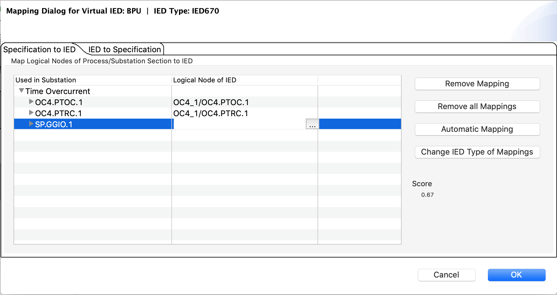 Sometimes, there may not exist a 1-to-1 matching of logical nodes in the specification and in the device. In this case, additional logical nodes can be brought into the function, using the ‘IED to Specification’ tab of the mapping dialog.
