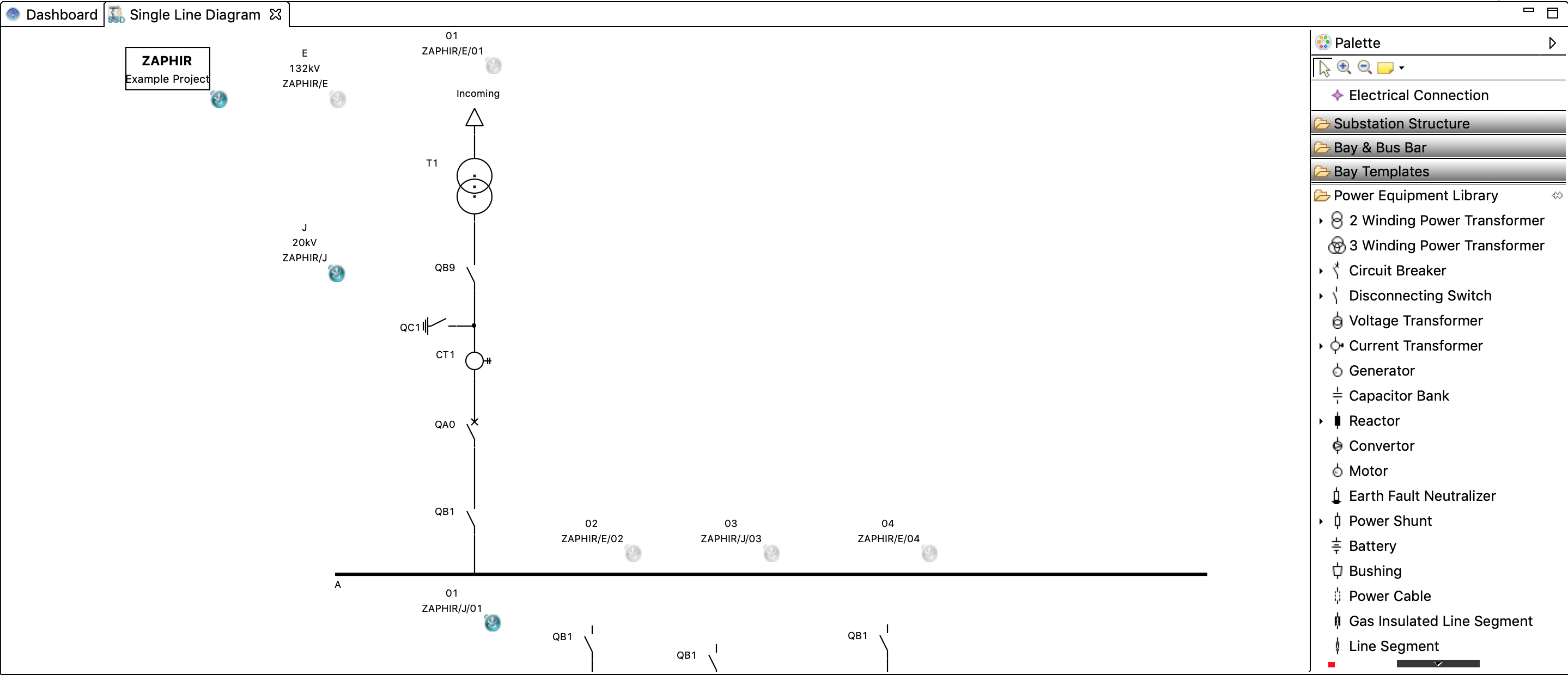 Selecting the Single Line Diagram in the Dashboard will open up a new main editor window tab next to the dashboard. In the Single Line Diagram you can create Substations, Voltage Levels, Bays, Busbars, and Power Equipment. You can also connect Power Equipment to other Power Equipment and to Busbars.